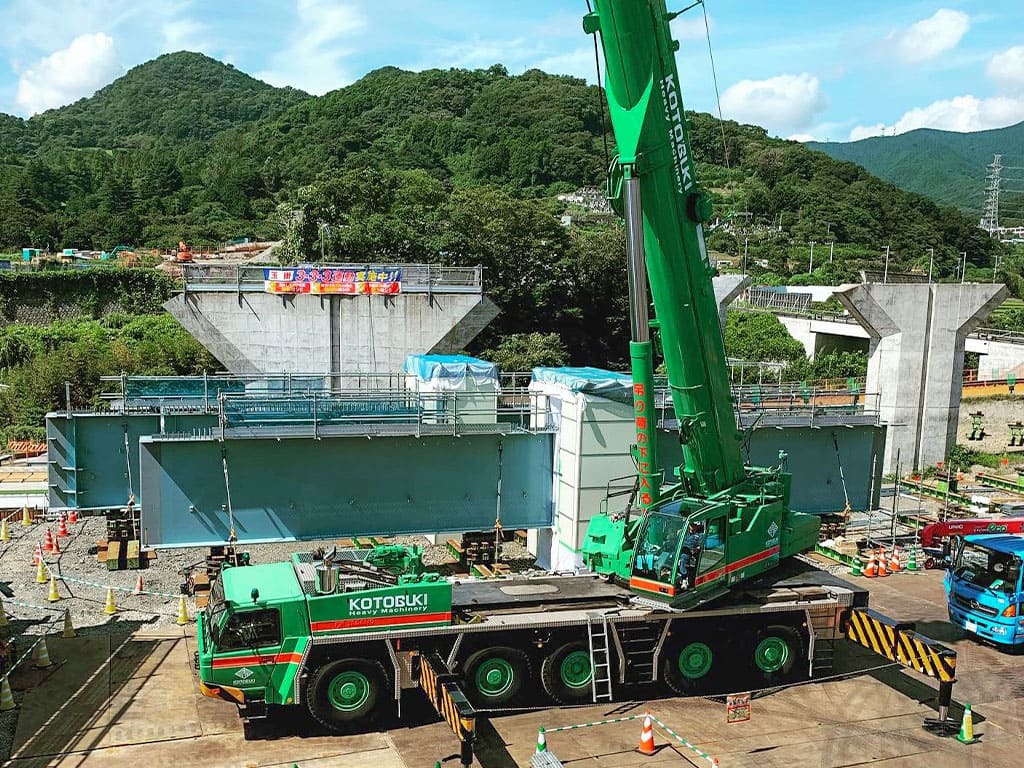 まずクレーンを使って鉄骨を吊るした後、仮ボルトやワイヤーで固定します。